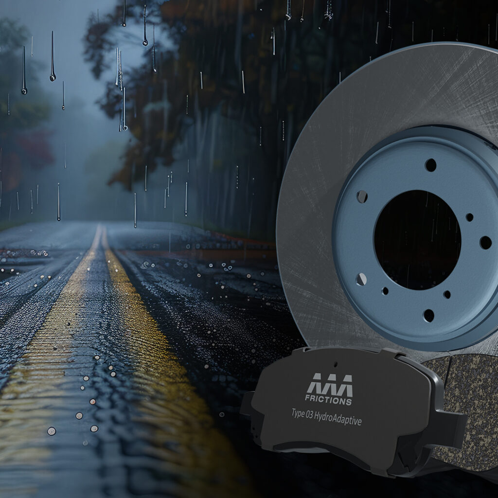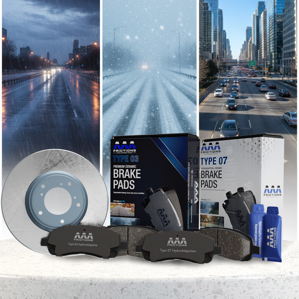 AAA Frictions’ HydroAdaptive Technology is engineered to keep braking performance steady when weather conditions become unpredictable. Built on our advanced ceramic system and refined through specialized scorching, HydroAdaptive adapts to rain, slush, snow, and humidity so the pad maintains a confident bite on every stop. Whether navigating frozen winter mornings or sudden thunderstorms, your brakes stay consistent anytime, any weather, anywhere.